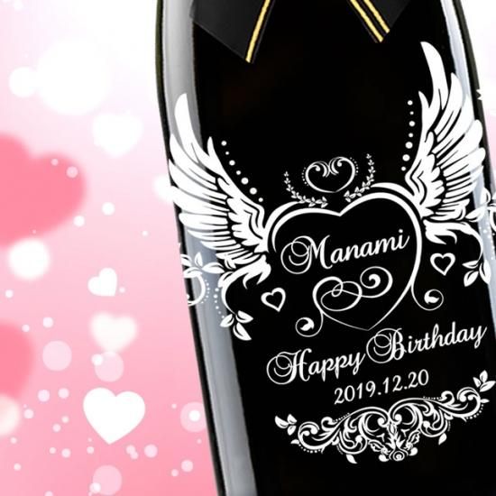 ハートと天使の羽をふんだんにあしらったデザインです。ゴージャスかつキュートらしさを全面に押し出したエンブレムなので、透明な洋酒が合うのかな? とつい思いがちですし、実際合いますが、意外と黒のボトルにも大人可愛くよく合うので、その辺りはお客様のお好みに合わせて。