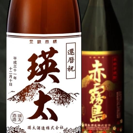 焼酎通なら誰しもが知る「霧島」風のデザインです。二双の山に、下に広がる花々。中央に大きく文字をデザインすることができるので、まるで贈られた人の名前がそのお酒のブランドになったかのうようです。いつものお酒だけれど、世界に1本のお酒。